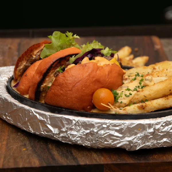 JUICY BEEF OR VEG PATTY IN A SOFT, HOMEMADE BEETROOT BUN WITH CARAMELIZED ONIONS, MUSHROOM CHEESE SAUCE, AND PICKLED RED CABBAGE, SERVED ON A SIZZLING DISH WITH HOT CHEESY MUSHROOM & CHIVE SAUCE UNDERNEATH. ACCOMPANIED BY HOMEMADE FRIES.