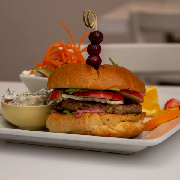 HOMEMADE APPLE TURKEY BURGER ON A BRIOCHE BUN. SPINACH, BRIE, SLICED AVOCADO, CRANBERRY AIOLI. SERVED WITH HOMEMADE SOUP OR HOUSE SALAD.