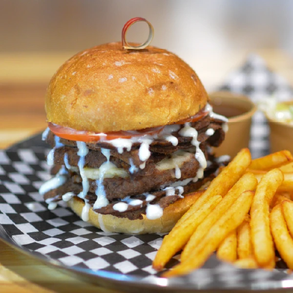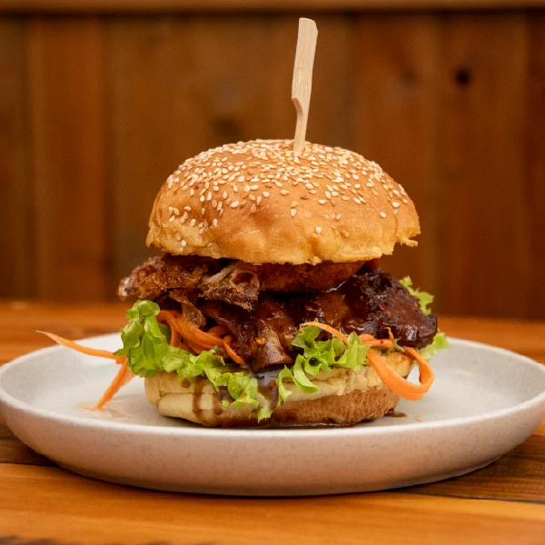 A flavorful fusion of East and West, our Beef Satay Burger features tender, marinated sirloin beef slices infused with aromatic satay spices. It’s topped with rich and creamy peanut sauce, shredded Gouda cheese, tangy pickled cucumber, and zesty pickled jalapeños for a spicy kick. All of this is nestled in a soft, toasted bun from The Golden Flour Bakery, ensuring the perfect balance of texture and flavor.
