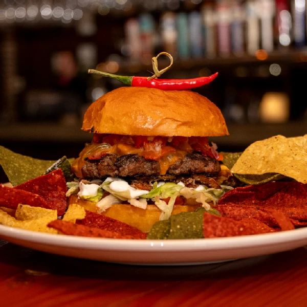 DESCRIPTION: TACO SEASONED PATTY ON A BUN WITH LETTUCE, CRISPY ONIONS, SOUR CREAM, SALSA, CRUSHED TORTILLA CHIPS, CHEESE, CHIPOTLE, PICO DE GALLO, AND CHILI PEPPER GARNISH. SERVED WITH A SIDE OF TORTILLA CHIPS.