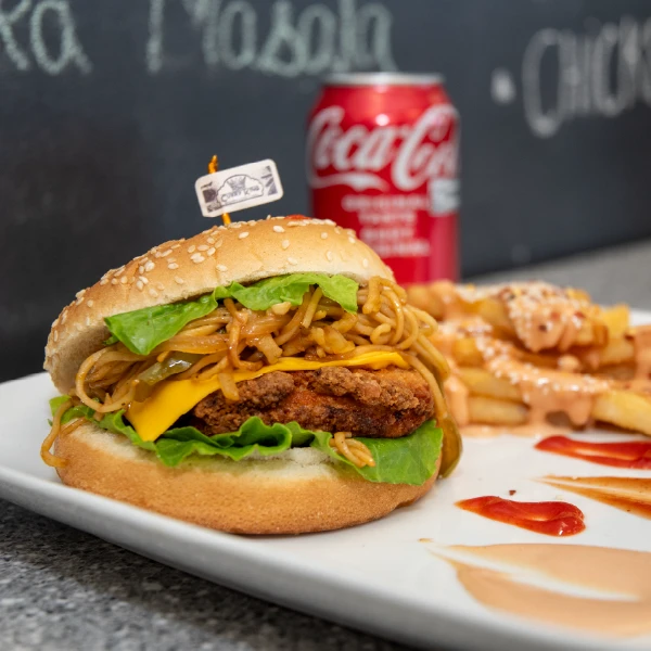 FRESH AND SOFT BURGER STUFFED WITH CRISPY CHICKEN PATTY WITH NOODLES, TOSSED IN A FLAVOURFUL SAUCES WITH SOY SAUCE, CHILI SAUCE, VINEGAR AND OTHER SEASONINGS, ALSO ADDED SLICE OF CHEESE, LETTUCE, ONION, AND CHEF SPECIAL FLAVOURED SAUCES