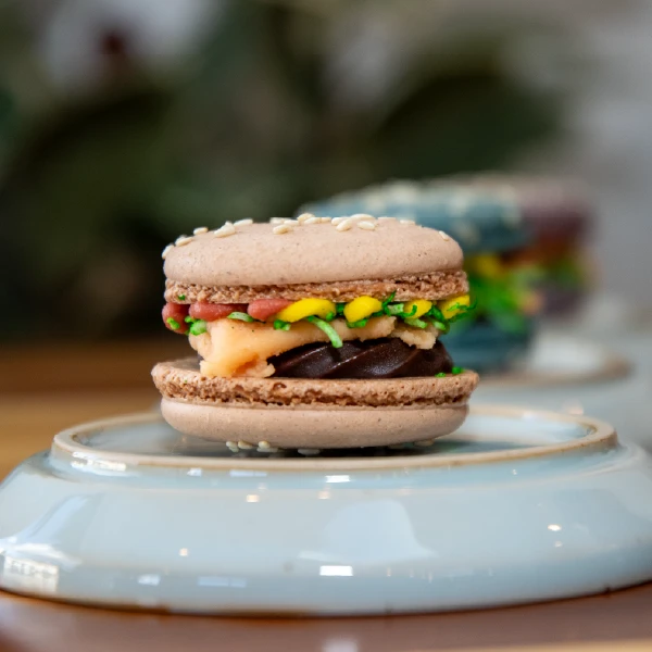 THE PRETTY PATTY IS A HANDCRAFTED FRENCH MACARON WITH YOUR CHOICE OUT OF 3 BEAUTIFUL STYLES. WE START WITH A TOASTED SESAME & ALMOND MACARON “BUN”, THEN WE LAYER ON THE DECADENT TAHINI GANACHE, CREAMY COCONUT BUTTER “CHEESE, MUSTARD & KETCHUP” WITH A GENEROUS SPRINKLING OF COCONUT “LETTUCE SHREDS.”