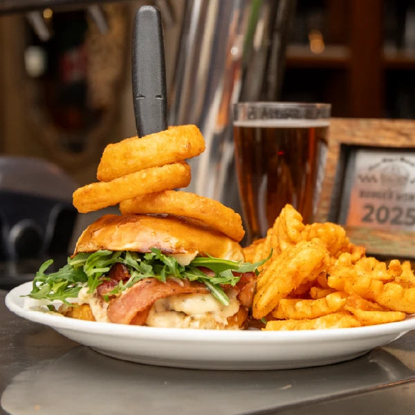 A LOCAL FRITZ BEEF PATTY WITH FRITZ’S SMOKY BACON, SMOTHERED IN A BOLD PEPPERONCINI CHEDDAR BLEND, BALANCED BY FRESH TOMATOES, LETTUCE, AND ONIONS, PICKLES AND FINISHED WITH A SWEET HONEY-BALSAMIC CARAMELIZED ONION RELISH & CREAMY GARLIC MUSTARD AIOLI.